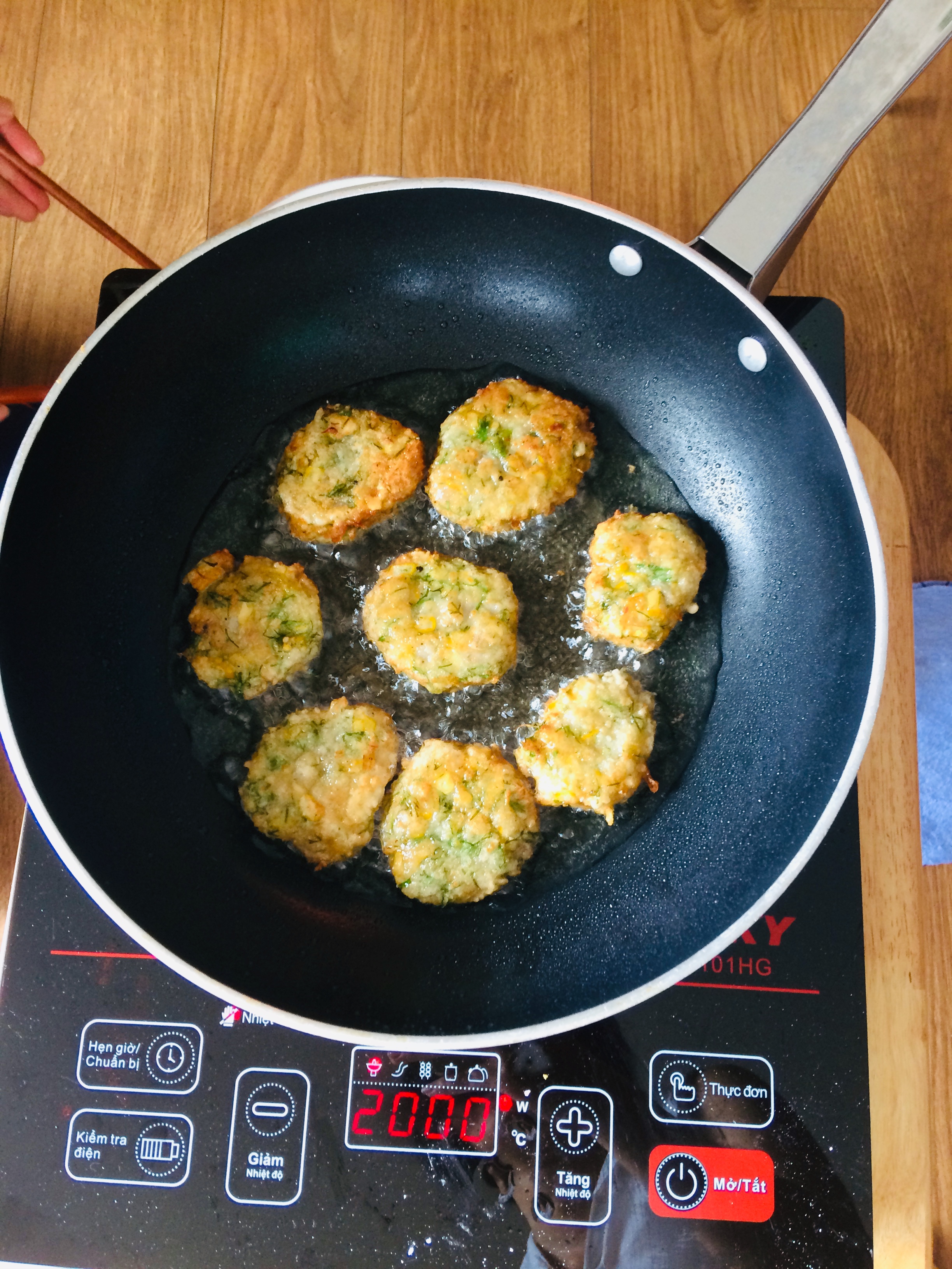 - Chả Chiên: Khoai môn nấu chín, tán nhuyễn lúc còn nóng. Đậu hũ trắng luộc chín, vắt nước lấy xác. Bắp mỹ bào mỏng, rau thì là cắt nhỏ, cho hạt nêm, tiêu, bột năng vào trộn đều, tay chạm vào thấy khô khô là được. Chả viên thành miếng, sau đó lăng qua bột gạo. Đun sôi dầu, chiên nhỏ lửa cho đến khi vàng đều.