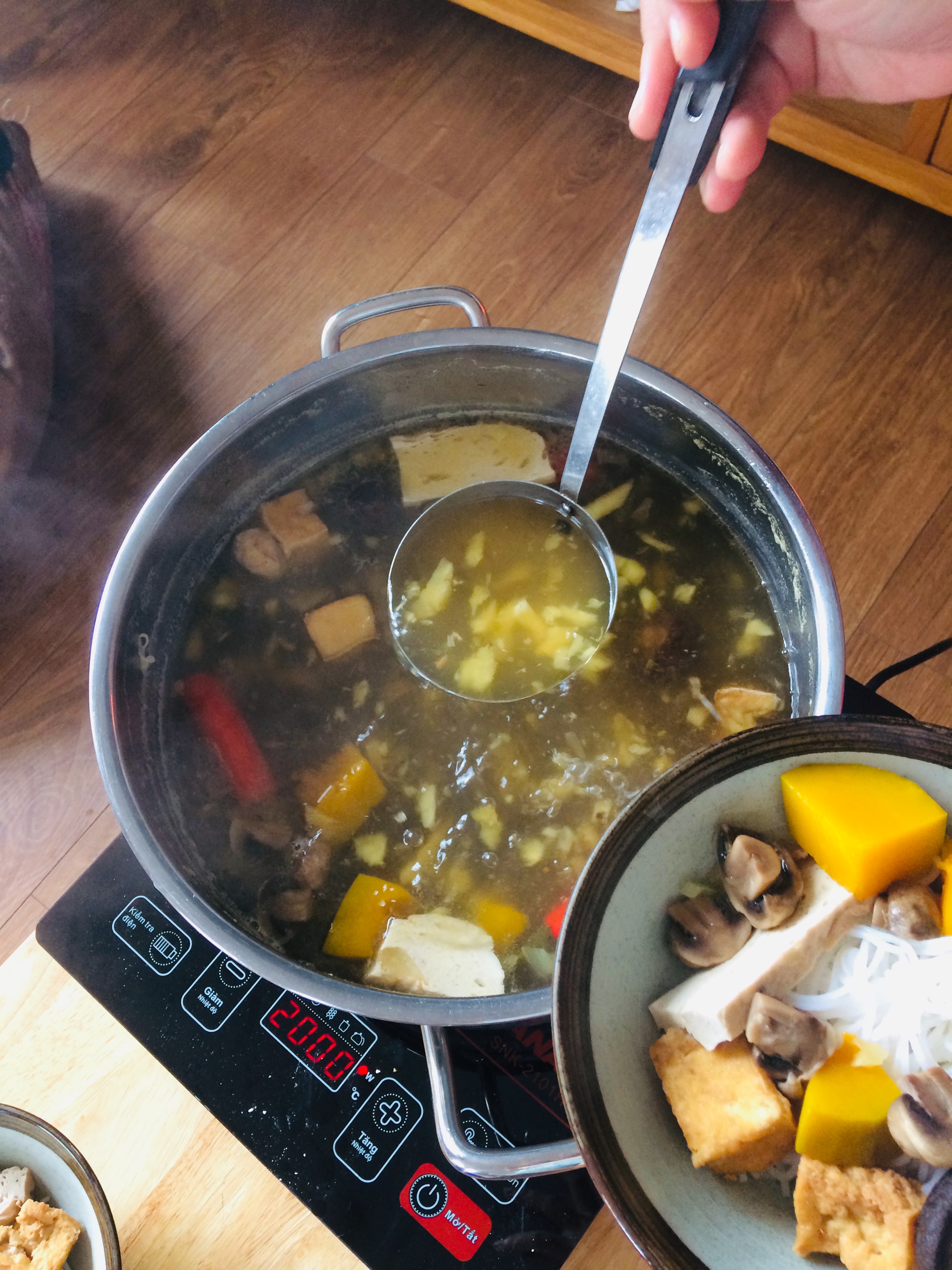 + Phi hành Boro, cho nấm đông cô, bí đỏ vào xào, cho thêm chút muối trộn đều. Sau đó cho nấm mỡ vào, tiếp theo cho đậu hũ chiên và chả quế vào xào. Khi xào xong cho toàn bộ vào nồi nưới dùng.