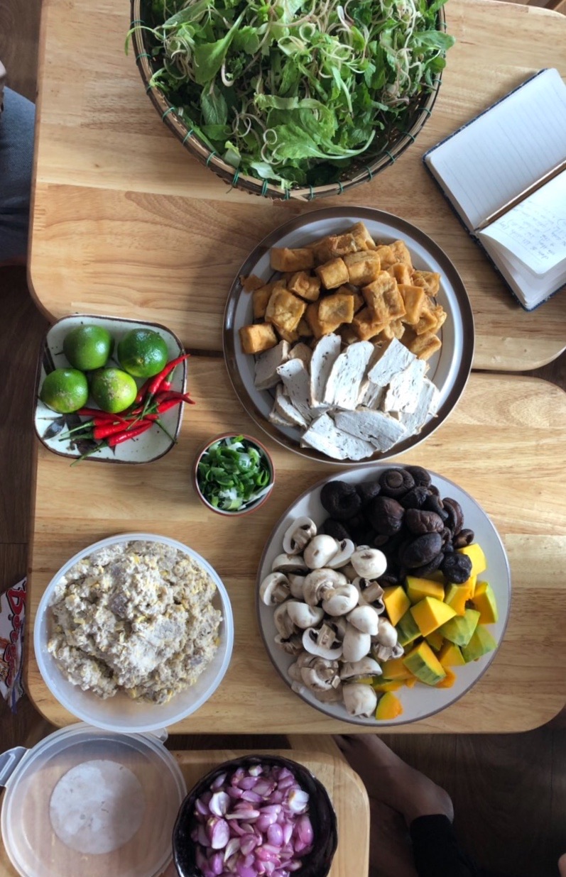 - Nguyên liệu chính: Nấm mỡ, nấm đông cô, bí đỏ, khoai môn, đậu hũ trắng, đậu hũ chiên, chả quế chay, bắp mỹ, thơm, bún tươi.